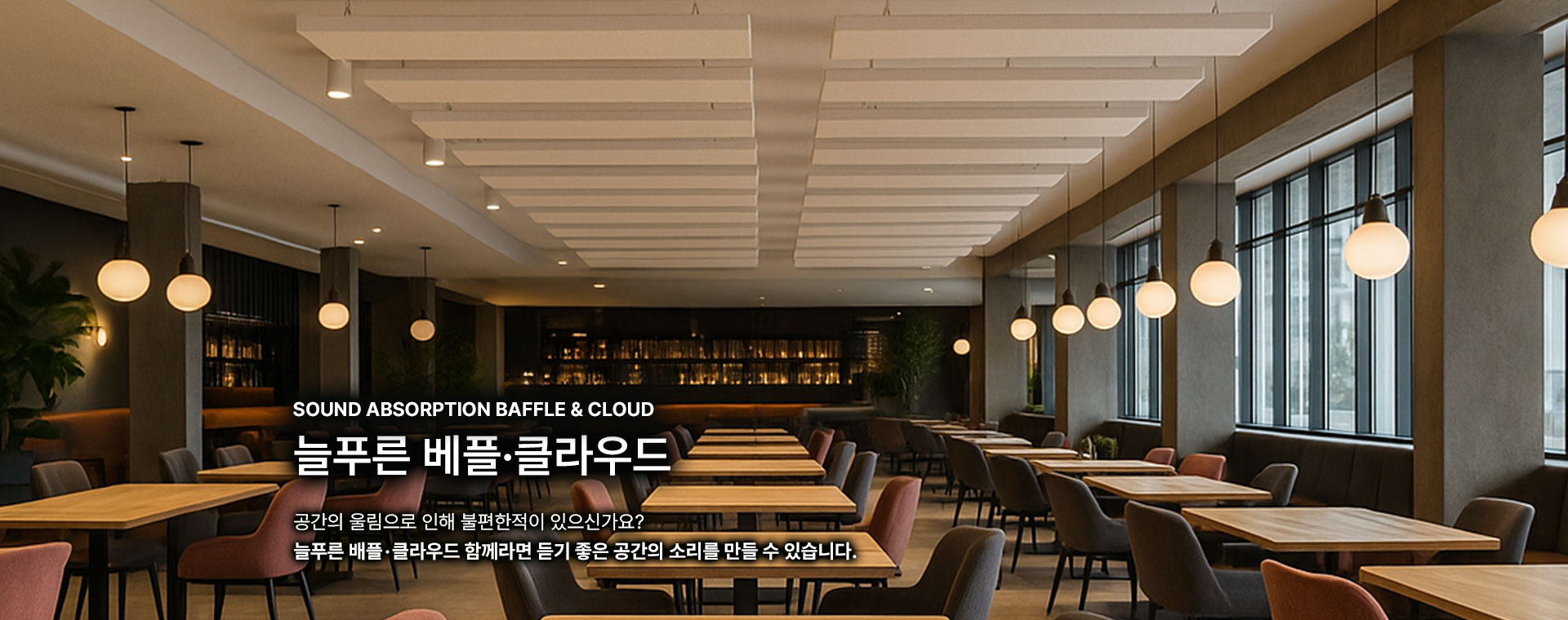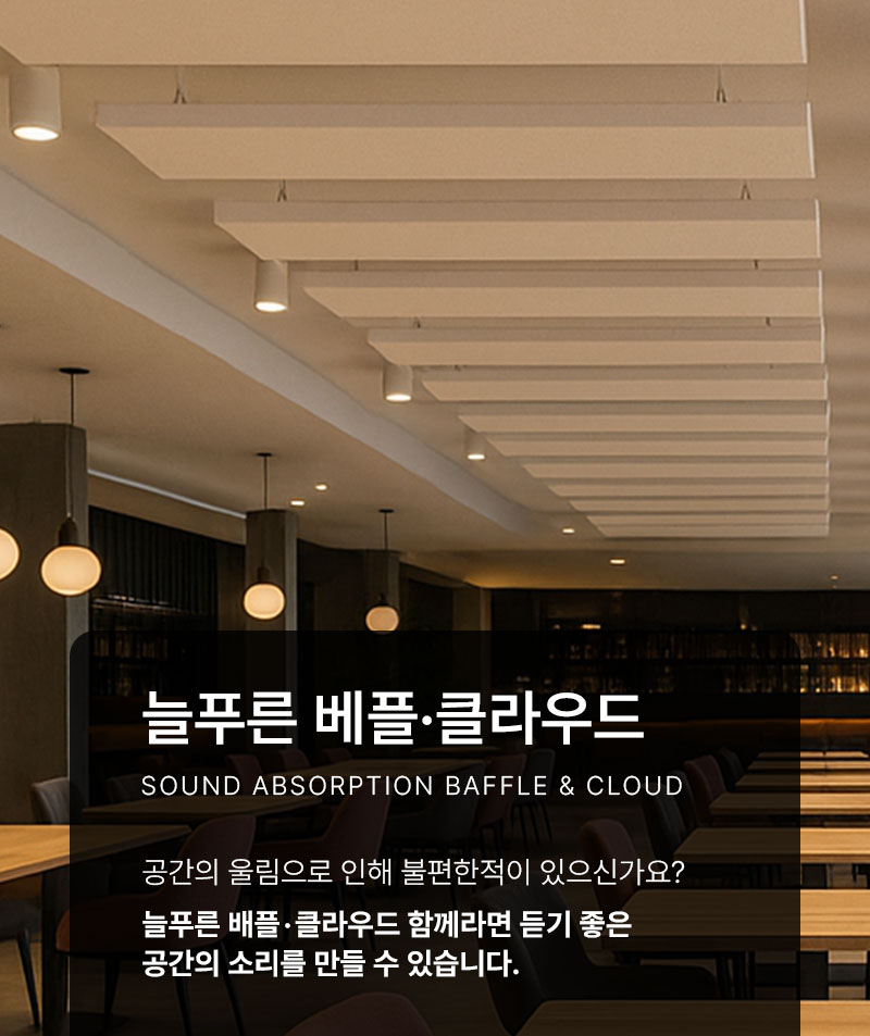 늘푸른 배플&클라우드는 천장의 음향, 조명, 구조, 디자인을 동시에 변화시킵니다.